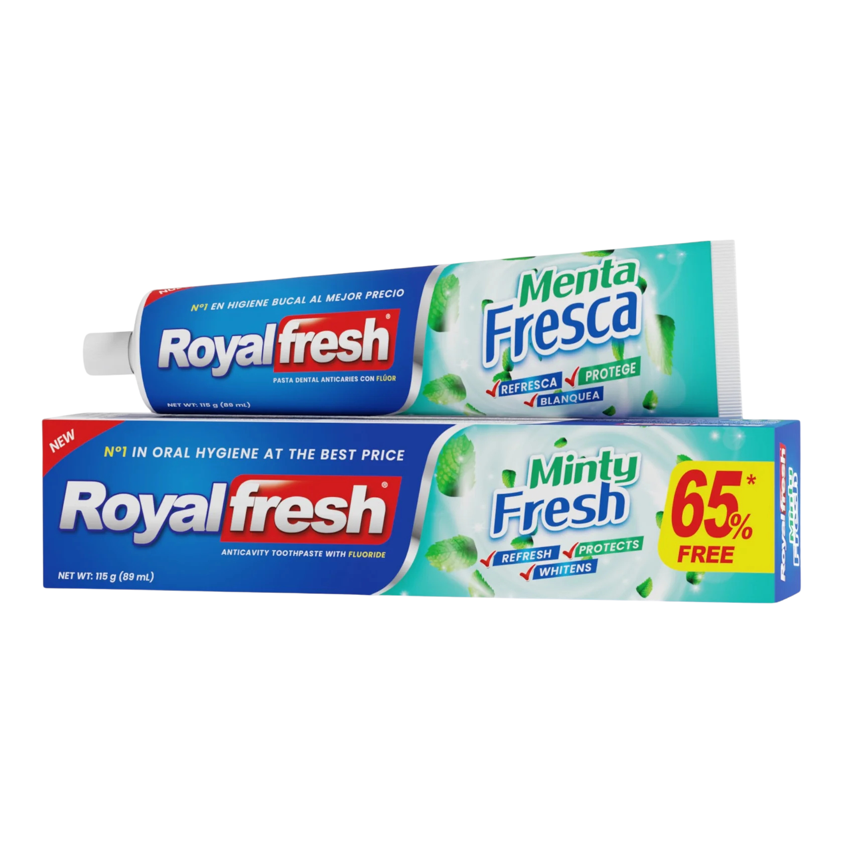 Pasta dental RoyalFresh en múltiples presentaciones. Marca propia también disponible con diseños personalizados según tu necesidad.